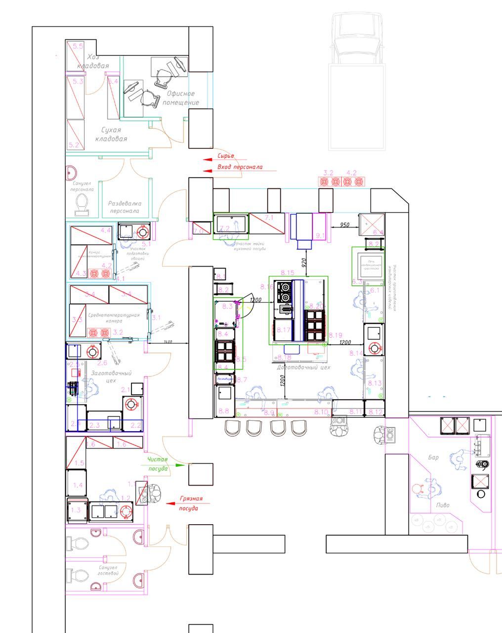 В отличии от так называемого «академического» проектирования, когда технолог-проектировщик только исполняет требования нормативов, не обращая внимания как по факту будут работать люди и осуществляться технологический процесс на производстве, мы выполняем проекты с учетом в первую очередь удобства работы и рациональному использованию площадей помещения, не нарушая при этом нормативов. Следует понимать, что нормативы опираются, в основе своей, на базу (с незначительными корректировками), которая была создана и разработана еще в советское время. В XXI веке давно применяются совсем другие машины и аппараты, действуют иные технологии – да даже классификация объектов сейчас ощутимо отличается от советской (например, откуда в 60-х годах было бы известно понятие «Столовая-кантина с free-flow потоком гостей»)! Также назначение объекта может с течением времени поменяться, следуя за рынком, и технологический проект должен это позволить сделать без перестройки помещений и с минимальными изменениями по инженерии.
